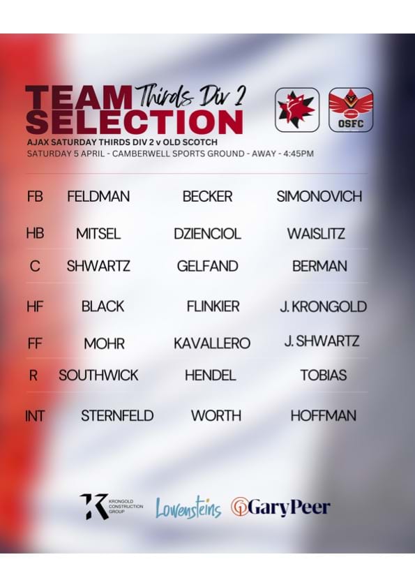 The Saturday Thirds fielding a team for the third consecutive year played against Old Scotch this week. It was a closely fought contest for most of the day with AJAX prevailing in the last quarter by 33 points. It was great to see many new faces amongst the old including an impressive debut by Tai Kavallero kicking 4 goals along with great first games from Lachie Mitsel and Oren Tobias