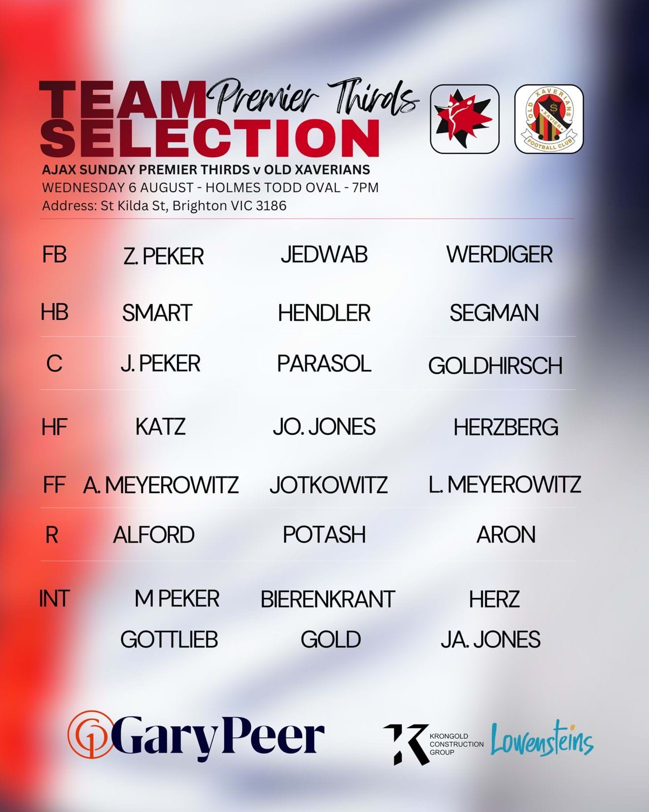 The second half saw the energy rise a level, as the now full strength crowd packed the sidelines for a thriller under the lights. AJAX looked strong in the 3rd quarter, kicking toward the crowded end of the oval as they took the game back on their terms, emphasized by strong tackles, smothers and pressure in typical AJAX brand footy. The team was able to lift a level above Xavs to regain the momentum of the game, winning the 3rd quarter by a goal to increase the lead to 15 points.